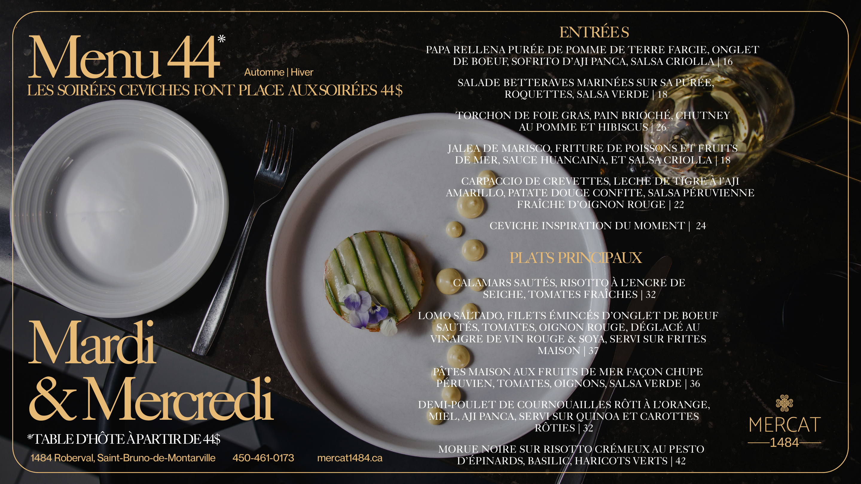 Certains éléments des menus peuvent changer selon la disponibilité des ingrédients et l'inspiration du chef
